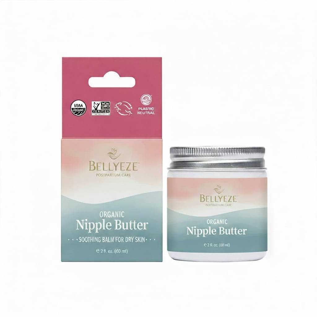 BELLYEZE Organic Nipple Butter is a gentle, natural solution specially crafted for new moms. Made with USDA Certified Organic ingredients, it deeply moisturizes and soothes dry, sensitive skin while being completely safe for both mother and baby.